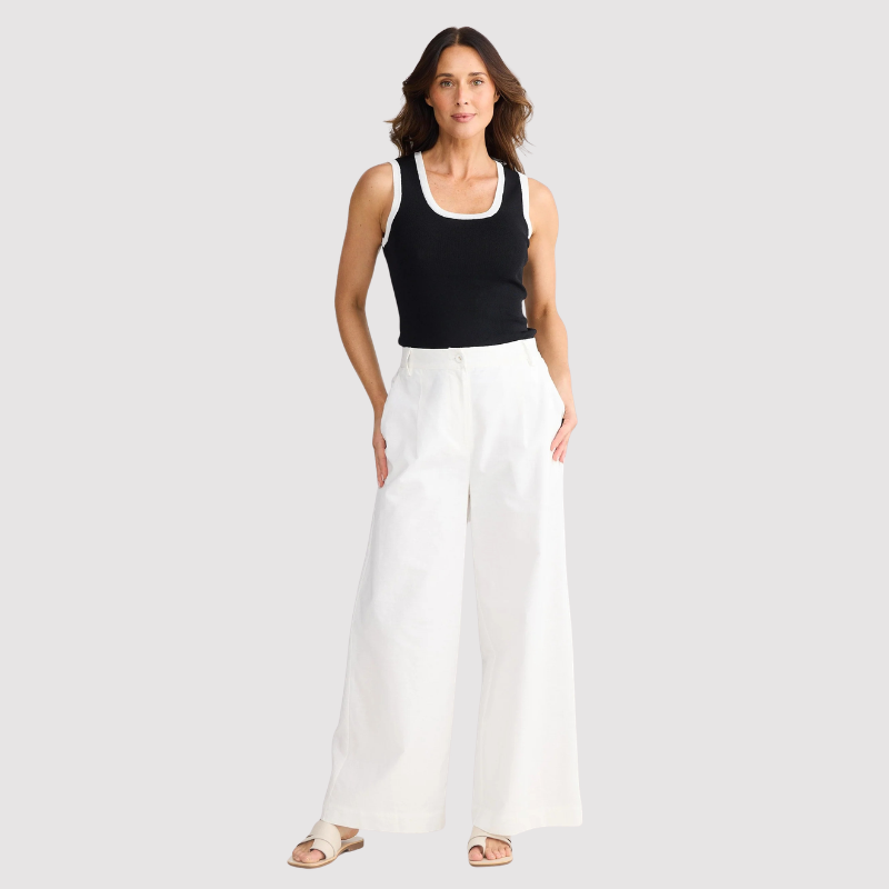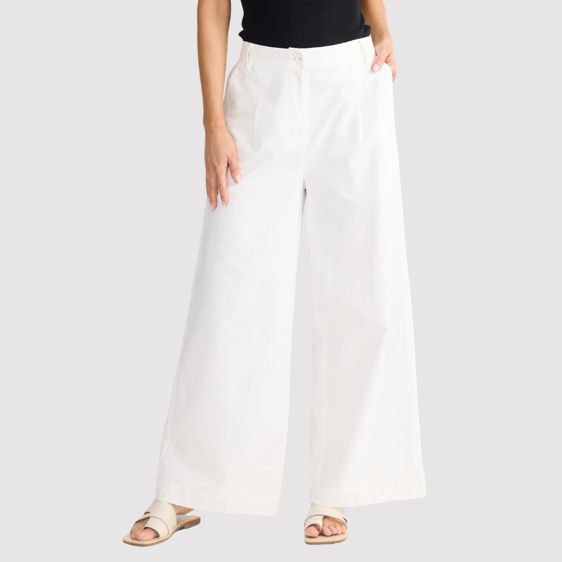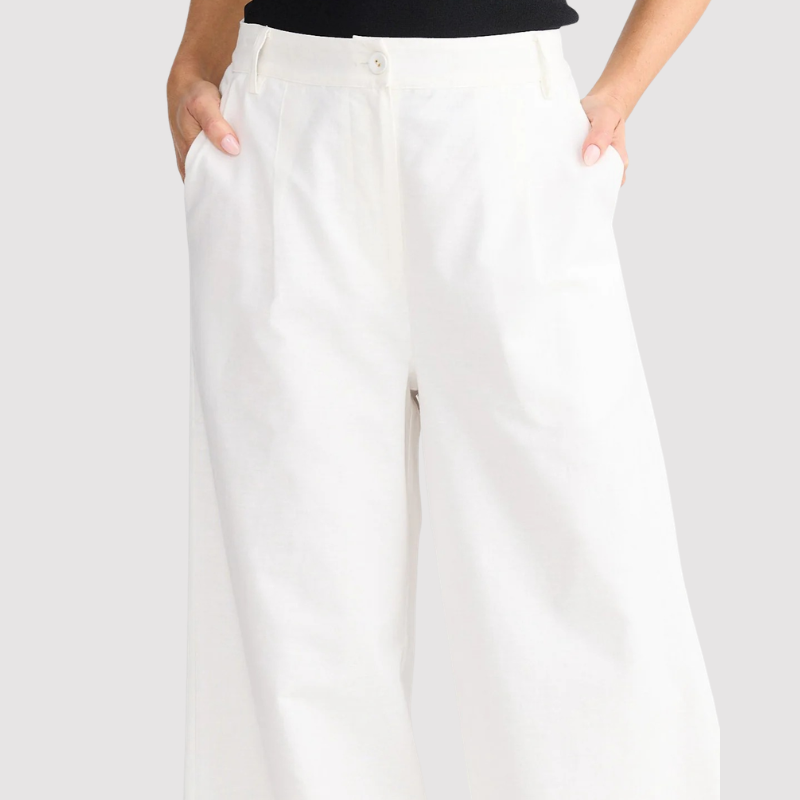 The August Pant in White is designed for effortless comfort and style. Featuring a natural waist fit with an elasticated back waistband, these pants move with you throughout your day. The functional zip fly and cutaway pockets offer practical convenience, while the wide-leg silhouette creates a relaxed, flattering shape. Full length styling makes them versatile for any occasion, whether you're dressing up or keeping things casual. A wardrobe essential that supports your natural movement and personal style.