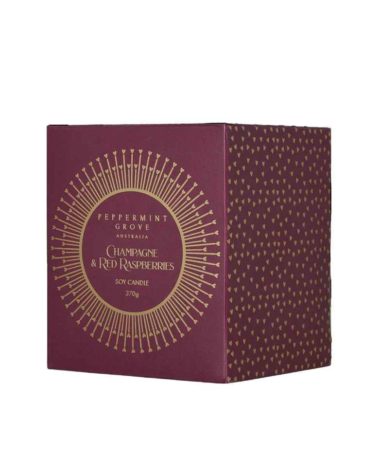 Immerse yourself in the essence of celebration with the Champagne & Red Raspberries 370g Candle. This limited edition soy candle delivers a complex fragrance that balances the sweetness of ripe strawberry, red raspberry, and pink lychee with the effervescent clarity of champagne, accented by floral hints of hyacinth and rose. Finished with a warm, creamy vanilla base, it evokes festive gatherings rich with tinsel, gifts, and indulgent moments. Presented in a sophisticated burgundy vessel adorned with gold flecks, it adds both aroma and elegance to any setting.