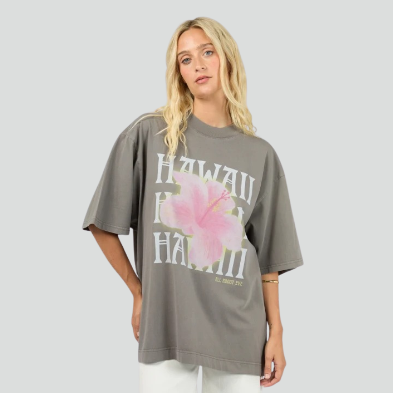 Escape to island vibes with the Hawaii Oversized Tee in charcoal. This relaxed essential combines effortless comfort with understated sophistication, featuring an exclusive graphic that adds visual intrigue to your everyday rotation. Crafted from 100% cotton, the generous oversized silhouette moves with you through sun-soaked days and casual moments alike. A versatile piece that transforms simple styling into something distinctly more refined.