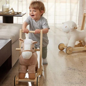 Encourage early mobility with this elegant Horse Walker, thoughtfully crafted to support sit-to-stand, rolling, pushing, and walking activities. Its robust frame combined with a plush finish and ergonomically designed handles ensures both comfort and stability for your child. Suitable for weights up to 30kg, this charming piece enhances any playroom while fostering development through engaging play. Assembly required.