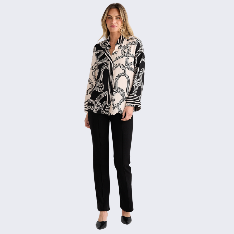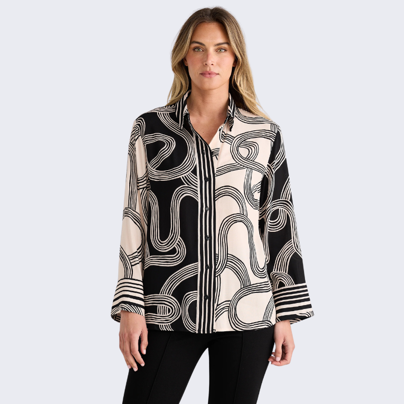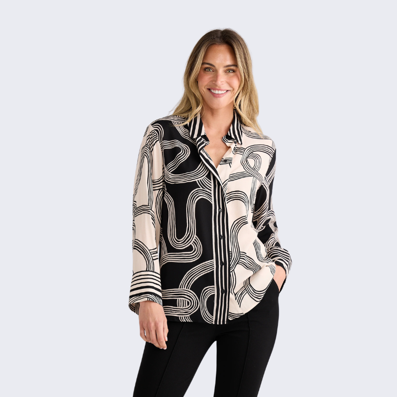 The Lucy Shirt – Ink Lines Multi features a striking abstract line print that brings an artistic edge to a classic silhouette. Designed with a relaxed yet flattering fit, this lightweight shirt is perfect for effortless everyday styling. Wear it tucked in for a polished look or loose for an easy, modern feel. Finished with thoughtful detailing for a refined touch, it’s a piece you’ll reach for again and again. Easy to pair with denim, tailored pants, or skirts, this shirt moves seamlessly from workdays to weekends.