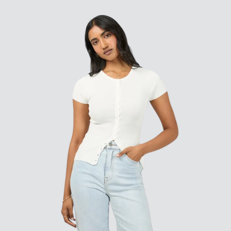 Meet your new wardrobe essential—the Olive Knit Top in crisp white! This beauty features an all-over rib knit that hugs you in all the right ways, delivering that perfect blend of feminine charm and everyday comfort. The button-through front with tonal buttons adds a polished touch that feels intentional without trying too hard. Crafted from a luxe viscose and nylon blend, it's soft against your skin and ready to play nice with everything from your favourite denim to flowing skirts and tailored trousers. Throw it on, style it your way, and watch how effortlessly it becomes your go-to layering piece.