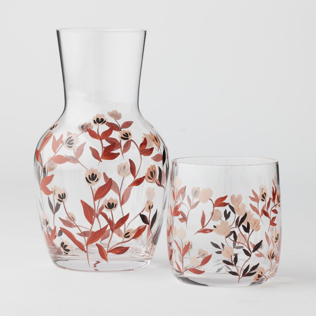 Sip with style in this charming Russet Vine Carafe Set! Each hand-painted piece features warm russet and blush vines that dance across the softly curved carafe and matching tumbler—no two sets are exactly alike. Perfect for quenching your thirst in colour or gifting to someone special, this 680mL duo arrives beautifully packaged and ready to impress. Artisanal, thoughtful, and utterly delightful.