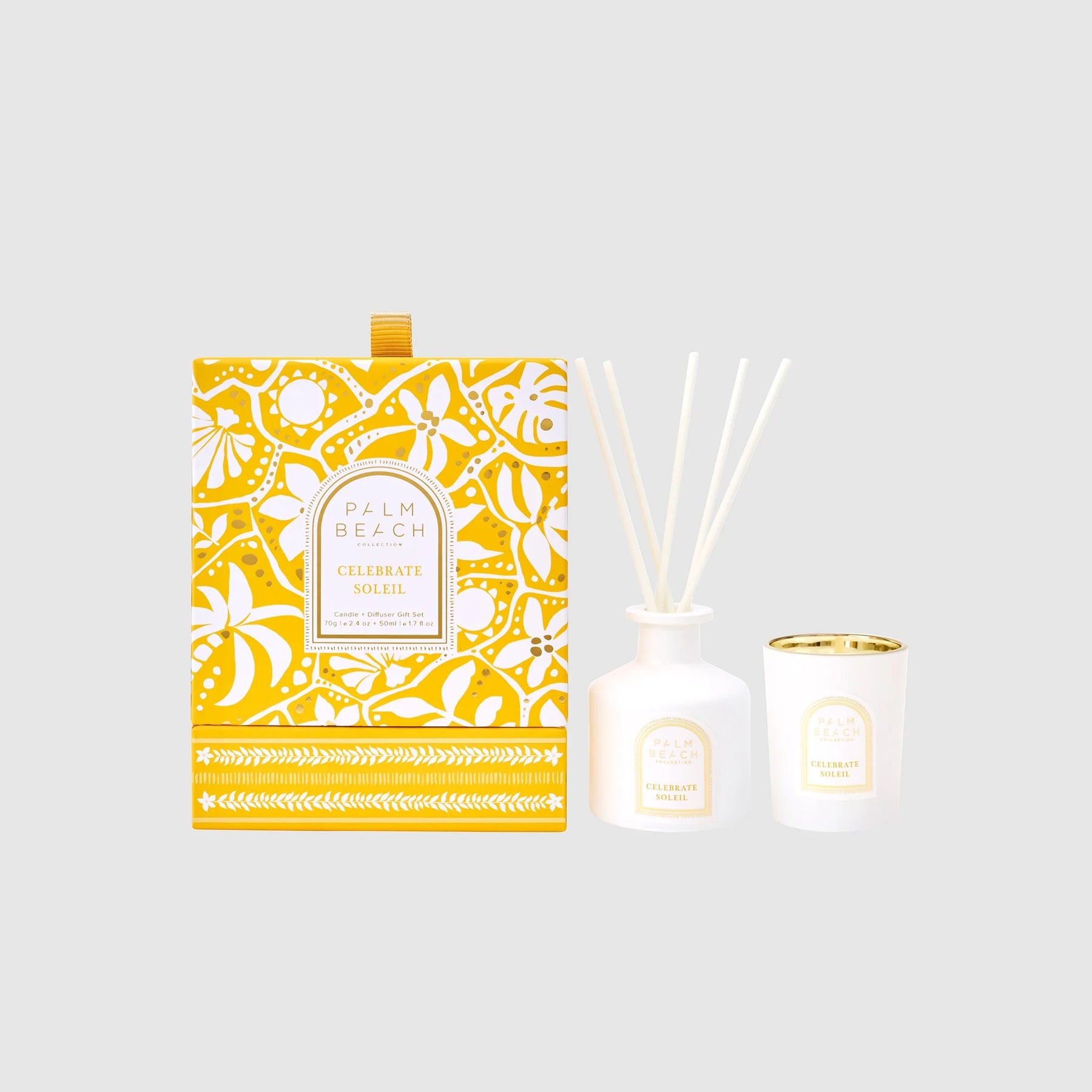 Celebrate Soleil Candle & Diffuser Gift Set captures the essence of summer with notes of ripe peaches, sunshine, floral breezes, and warm sand. This expertly curated pairing offers a harmonious blend of fragrances that warm your living space with a festive and inviting ambiance. Ideal for layering, it makes a thoughtful gift for anyone passionate about home fragrance, enhancing any room with the bright, uplifting scents of the season.