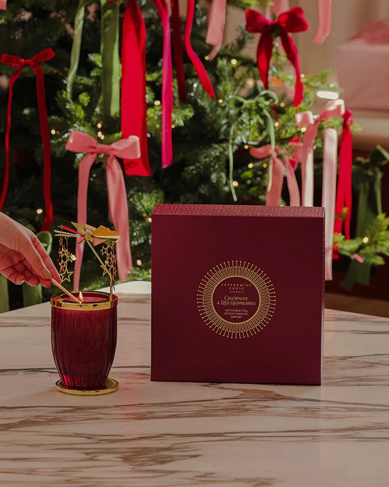 Elevate your festive décor with the Champagne & Red Raspberries Carousel Gift Set, a limited edition masterpiece. As the candle burns, star-shaped ornaments delicately spin, casting mesmerizing shadows and shimmering lights to enchant any room. Experience a sophisticated fragrance blend featuring ripe strawberry, red raspberry, pink lychee, melon, and green leaves, enriched with elegant notes of champagne, hyacinth, and rose, and warmed by a creamy vanilla base. This gift set offers both visual delight and a refined scent experience, perfect for creating a memorable seasonal ambiance.