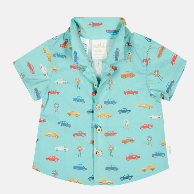 Introducing the Boys Shirt in Banjo/Utes Teal—a sophisticated piece designed for the modern young gentleman. Crafted entirely from premium 100% cotton, this shirt features a refined collar and short sleeves that seamlessly transition from casual weekends to more polished occasions. The front opening is secured with natural wooden buttons, adding an artisanal touch while ensuring easy dressing. Adorned with Toshi's exclusive Banjo print design, this shirt combines thoughtful craftsmanship with enduring quality. Built to withstand childhood's greatest adventures while maintaining its elegant appeal.
