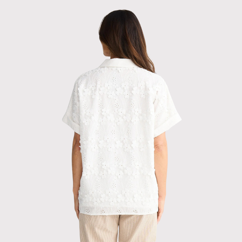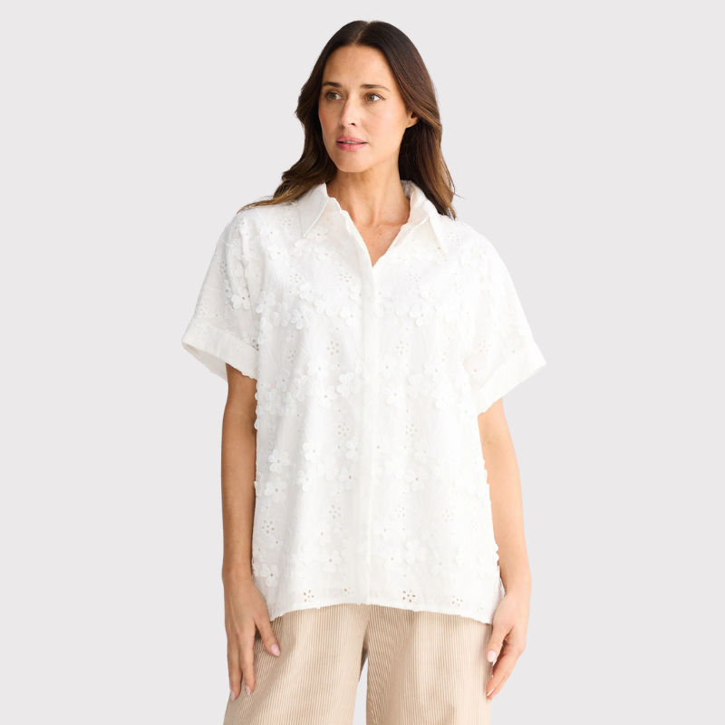 The Felicity Shirt brings effortless charm to your wardrobe with its classic two-piece collar and grown-on cuff sleeves that feel as good as they look. Featuring a concealed front button placket for a polished finish, this relaxed-fit beauty showcases delicate raised broderie fabrication that adds texture and visual interest. Fully lined for comfort and durability, it's the perfect piece for layering or wearing solo—ready to brighten any season.