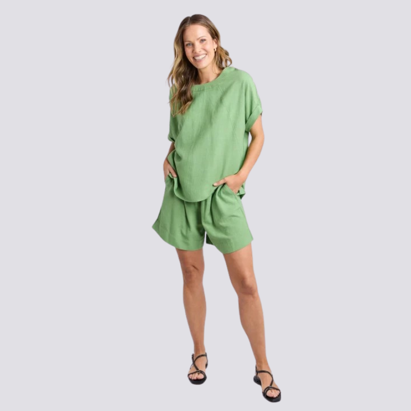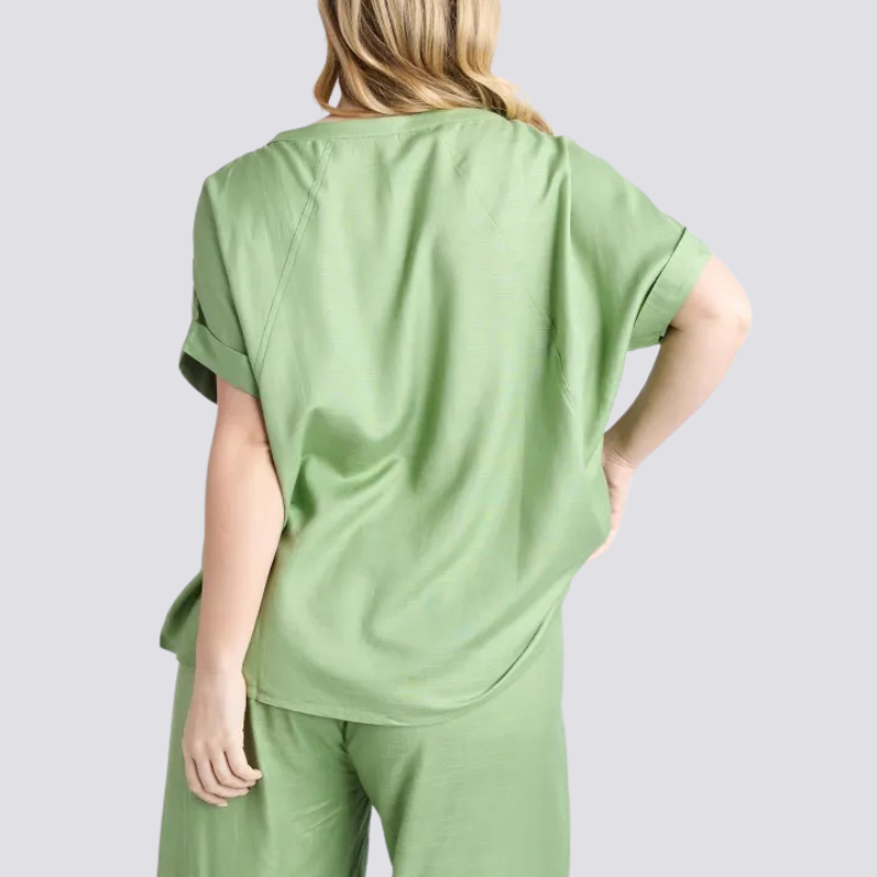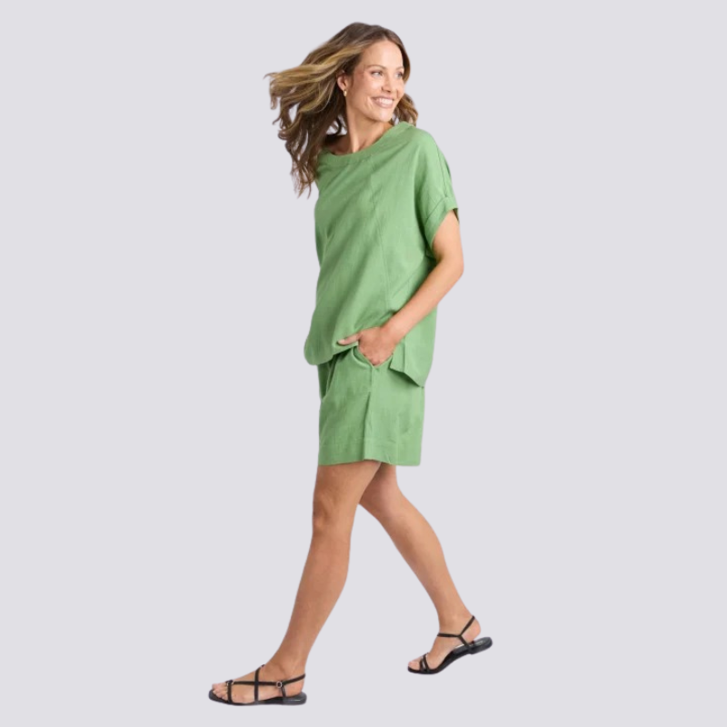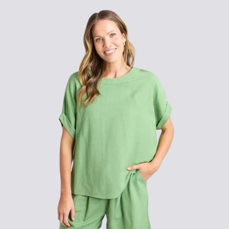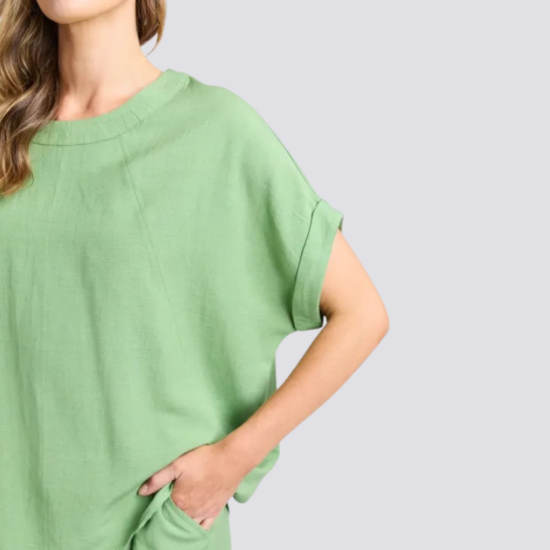The Holly Top delivers everyday comfort with understated sophistication. Crafted from a breathable blend of 30% linen and 70% viscose, this piece offers the relaxed ease of your go-to tee with a refined, elevated aesthetic. The generous relaxed fit and timeless tee silhouette make it effortlessly versatile—perfect for layering or wearing solo across seasons. Whether you're dressing down or elevating a casual look, the Holly Top supports your style with comfort that feels as good as it looks.