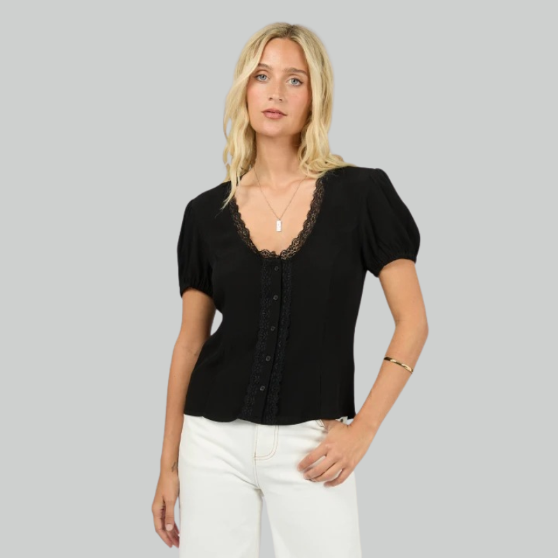 The Maybelle Top in black is a versatile summer essential that seamlessly transitions from casual to polished. Crafted from 100% viscose, this piece features delicate lace detailing at the neckline and placket, paired with softly gathered pouf sleeves that create a flattering, feminine silhouette. Functional front buttons add refined structure without compromising comfort. Whether styled with tailored trousers for a sophisticated look or layered over summer skirts for an effortlessly romantic aesthetic, the Maybelle Top delivers understated elegance with everyday wearability.