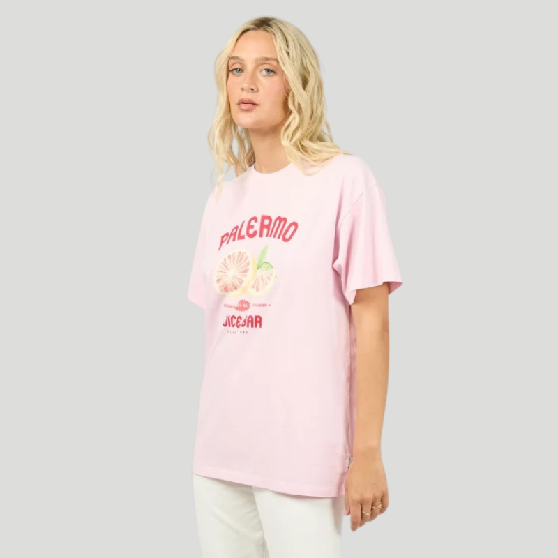 The Palermo Relaxed Tee redefines casual elegance with a charcoal backdrop accented by vivid red lettering and a lively grapefruit motif, offering a refined yet playful aesthetic. Crafted from soft cotton, its relaxed silhouette ensures comfort without sacrificing style. Ideal for pairing with denim or tailored wide-leg pants, this tee effortlessly elevates your everyday wardrobe with a subtle yet distinctive edge.