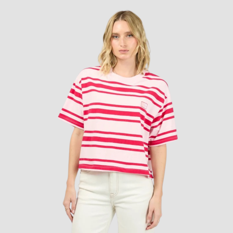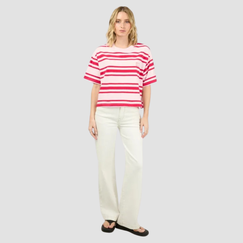 The Ruby Crop Relaxed Tee brings a burst of energy with its vibrant red and pink stripes, perfectly paired with a breezy, cropped fit. Featuring a subtle All About Eve logo patch, this tee strikes the ideal balance between playful charm and casual comfort. Whether matched with high-waisted jeans or denim shorts, it’s your go-to for an effortlessly cool, off-duty vibe.