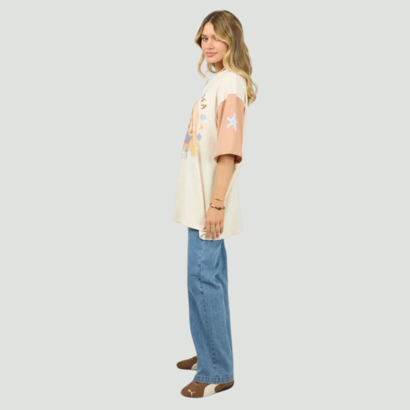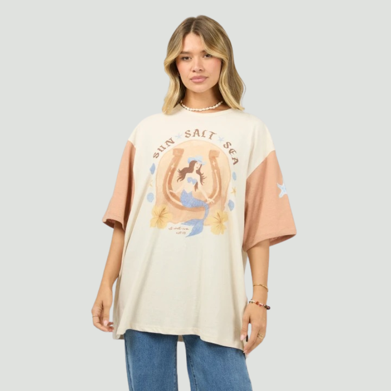 Experience effortless style with the Sun Salt Sea Oversized Tee. Crafted from a breathable hemp-cotton blend, this relaxed-fit top offers all-day comfort with a vintage-washed softness. Featuring bold Hawaiian cowgirl mermaid graphics and contrasting sleeves, it adds a playful, unique edge to your casual wardrobe. Perfectly paired with denim and boots, this tee is your go-to for laid-back, off-duty cool.