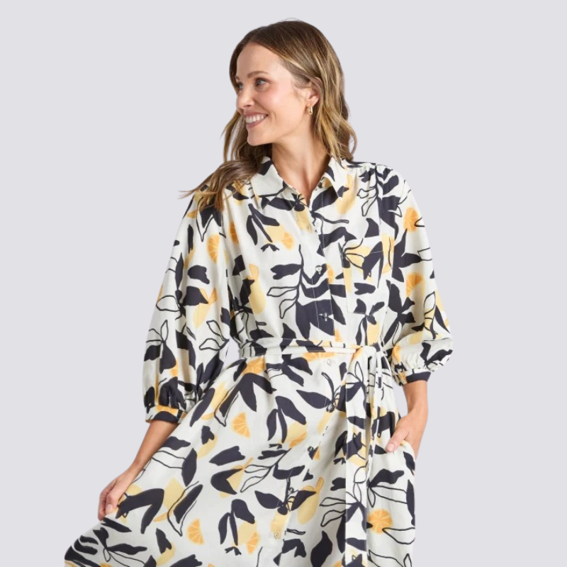 The Limone Dress showcases our beloved button-through silhouette in a vibrant leaf print that transitions effortlessly from office to evening. Crafted from a breathable lyocell and linen blend, this versatile piece features a self-fabric waist tie that defines your shape while maintaining elegant comfort. A timeless design that works as hard as you do.