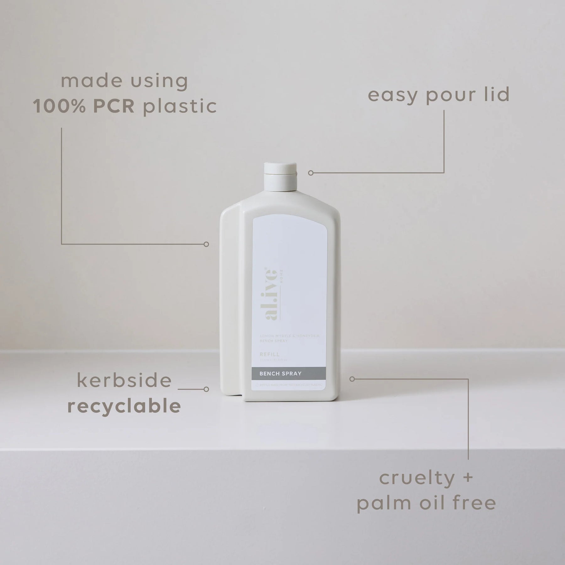 Refresh your kitchen with our 1 L Lemon Myrtle & Honeydew Kitchen Bench Spray Refill! Packed in a tough bottle made from 100% recycled plastic, it’s a smart swap for single-use waste. This gentle, naturally sourced cleaner tackles everyday messes and leaves your surfaces sparkling with a fresh, zesty scent. Designed to refill your 300 ml al.ive spray bottle more than three times, it’s easy to pour, store, and recycle—keeping your kitchen clean and your conscience clear!