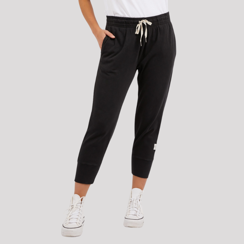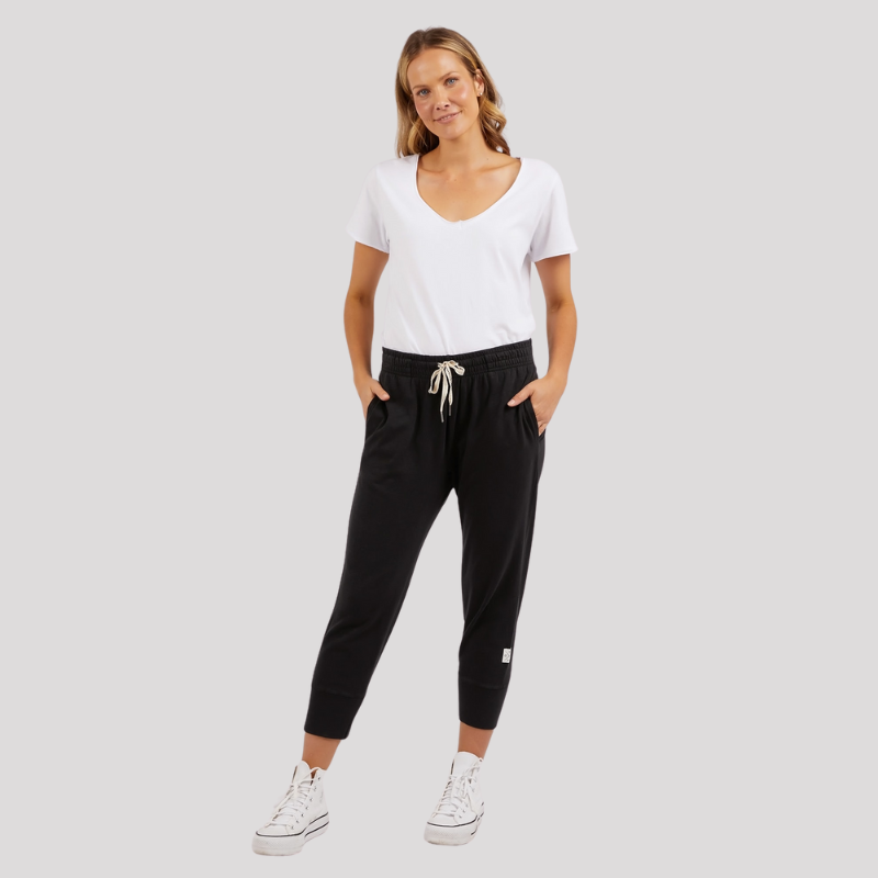 Effortlessly stylish and comfortable, the Black Brunch Pant size 6 from Elm's collection is a must-have for any wardrobe. Made with soft and breathable cotton slub jersey, these popular cropped pants feature an elastic waistband with an adjustable tie for the perfect fit. The roomy design and large cuff detail make them versatile for any occasion. Expertly crafted for all-day wear.