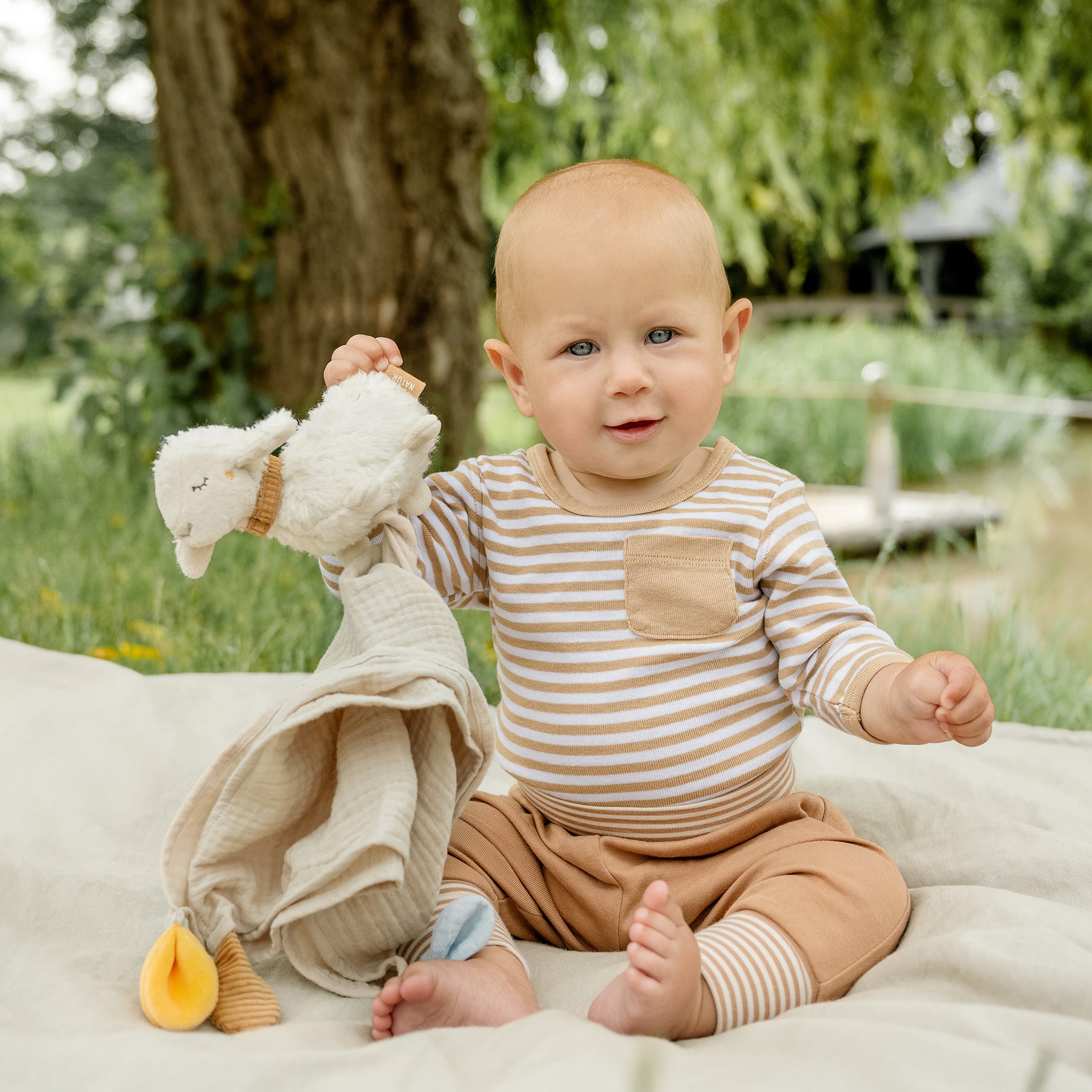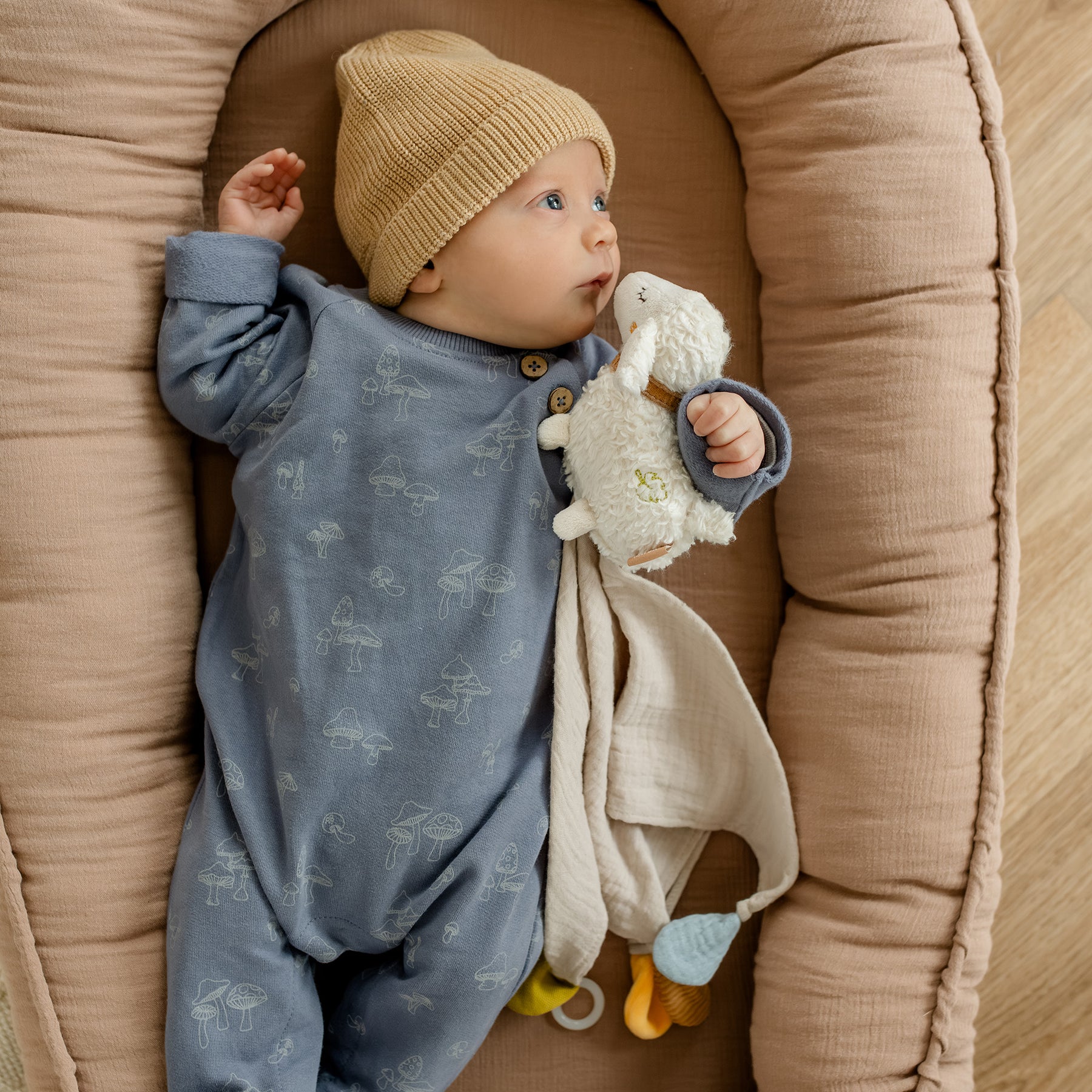 Meet the fehnNATUR® Comforter Sheep! This lovable sheep is made with certified organic cotton, providing a soft and sustainable touch for your little one. It doubles as a comforter and dummy holder, making it the perfect companion for home or on the go. Plus, it works with all conventional dummies (with or without handles)!