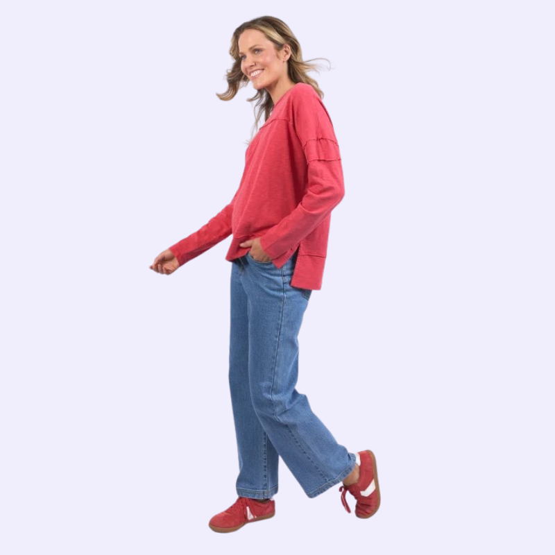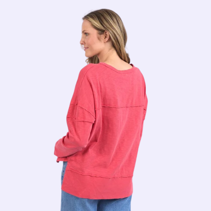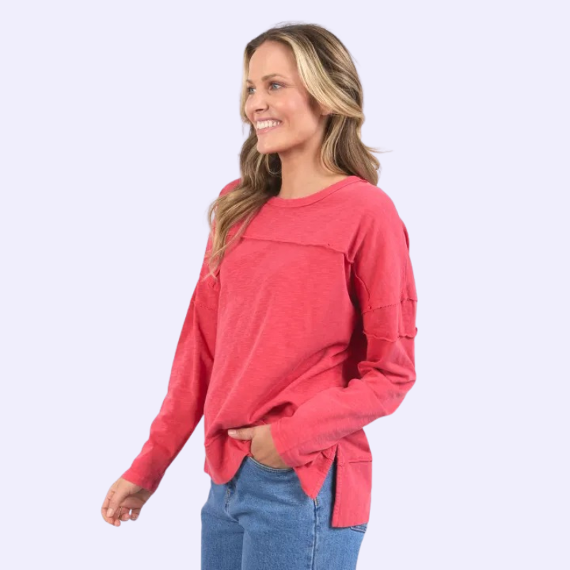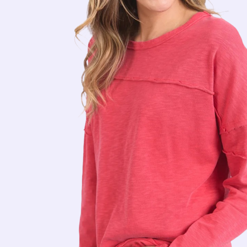 The Jayne Throw On Top offers a refined layering option crafted from soft, 100% cotton slub jersey. Its lightweight design, crew neck, and chic exposed stitching create understated sophistication, while the side split hi-low hem adds elegant movement. Perfectly versatile, this long sleeve top ensures comfort and style through changing seasons.