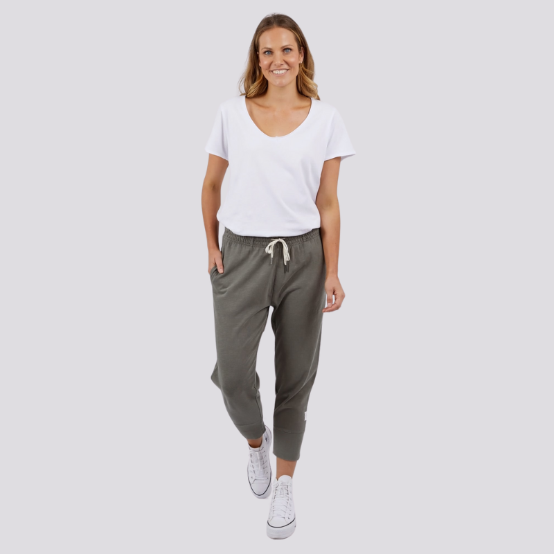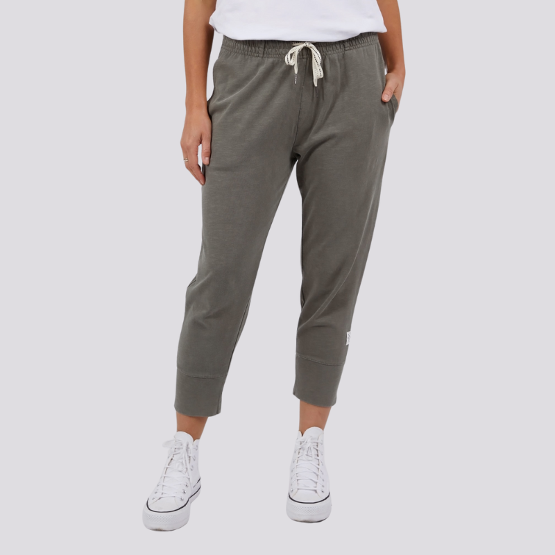 Stay comfortable and versatile with Elm's bestselling Khaki Brunch Pant in size 6. The relaxed, roomy fit is perfect for any occasion, while the elastic waistband and adjustable tie provide a comfy fit. Made with cotton slub jersey, these cropped pants feature a large cuff detail for added style.