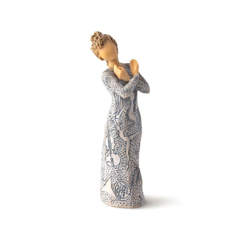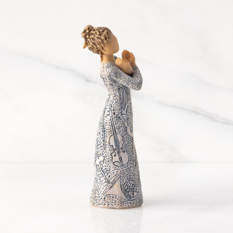 This exquisite piece, is a perfect gift for musicians and performers. It features intricate carvings of musical symbols, instruments, and dancing figures. A unique and meaningful present for those who share their talents through teaching or performance, or simply enjoy the performing arts. Comes in a Willow Tree gift box with a special gift tag with sentiment "Moved by the power of music".