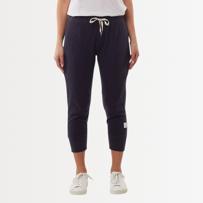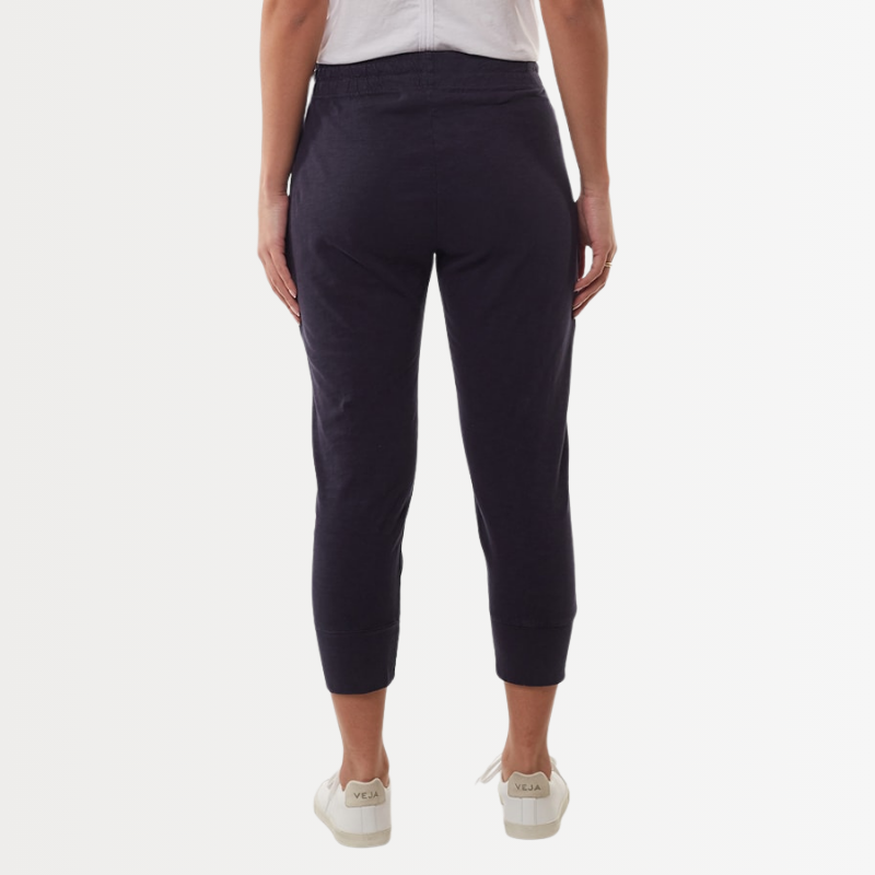 The Navy Brunch Pant in size 6 is a must-have in your wardrobe. Made from 100% cotton slub jersey, it offers a relaxed and roomy fit, perfect for any occasion. The elastic waistband, adjustable tie, and large cuff detail add comfort and style to these versatile cropped pants. Formal yet comfortable, these pants are ready to be your go-to choice.