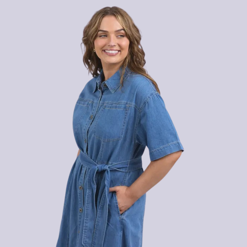 Make a statement with the River Denim Dress, a striking long-line silhouette featuring a tie waist and sleek button-through shirt style. Made from sturdy rigid denim, this dress adapts seamlessly from casual sneaker vibes to chic sandal or boot ensembles, embracing versatility with edgy confidence.