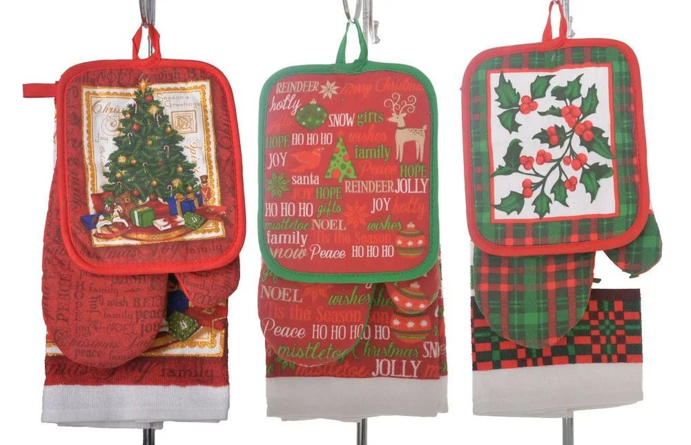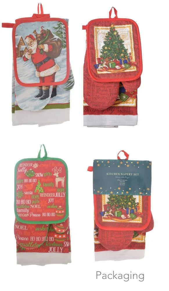 Transform your holiday kitchen with this festive 3-piece napery set, designed to bring seasonal charm to your dining experience. This coordinated collection features premium kitchen textiles perfect for Christmas gatherings and everyday entertaining. Each piece combines practical functionality with elegant holiday styling, making it an ideal choice for those who appreciate both aesthetics and quality. Whether you're hosting a festive feast or adding a touch of seasonal warmth to your kitchen, this versatile set delivers style and comfort throughout the holiday season.