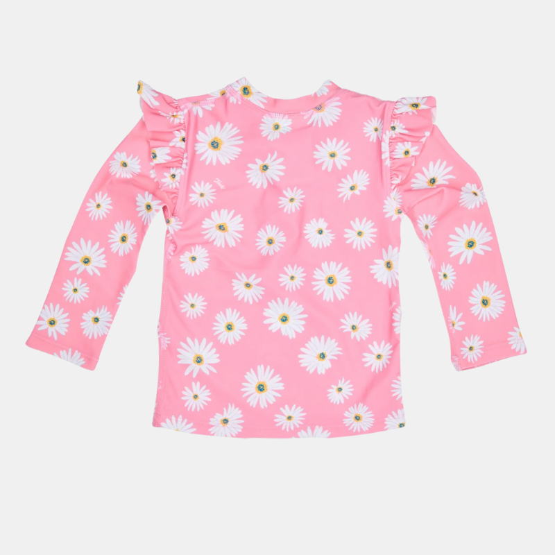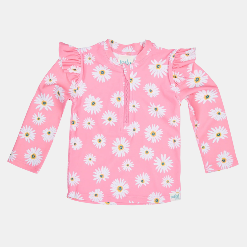 Toshi's Swim Rashie Daisy Watermelon combines timeless elegance with practical sun safety for your little one. Crafted from premium, fast-drying fabric rated UPF50+, this rashie delivers comprehensive protection against harmful rays whilst remaining chlorine and salt water resistant. The thoughtfully designed high neckline and long sleeves maximise coverage, whilst charming shoulder frills add playful sophistication. Seamless side construction ensures superior comfort and a refined fit. Convenient front-zip neckline and press-stud nappy opening streamline dressing and changes. Finished with an exclusive Toshi print design, this is elevated swimwear that doesn't compromise on functionality or style.