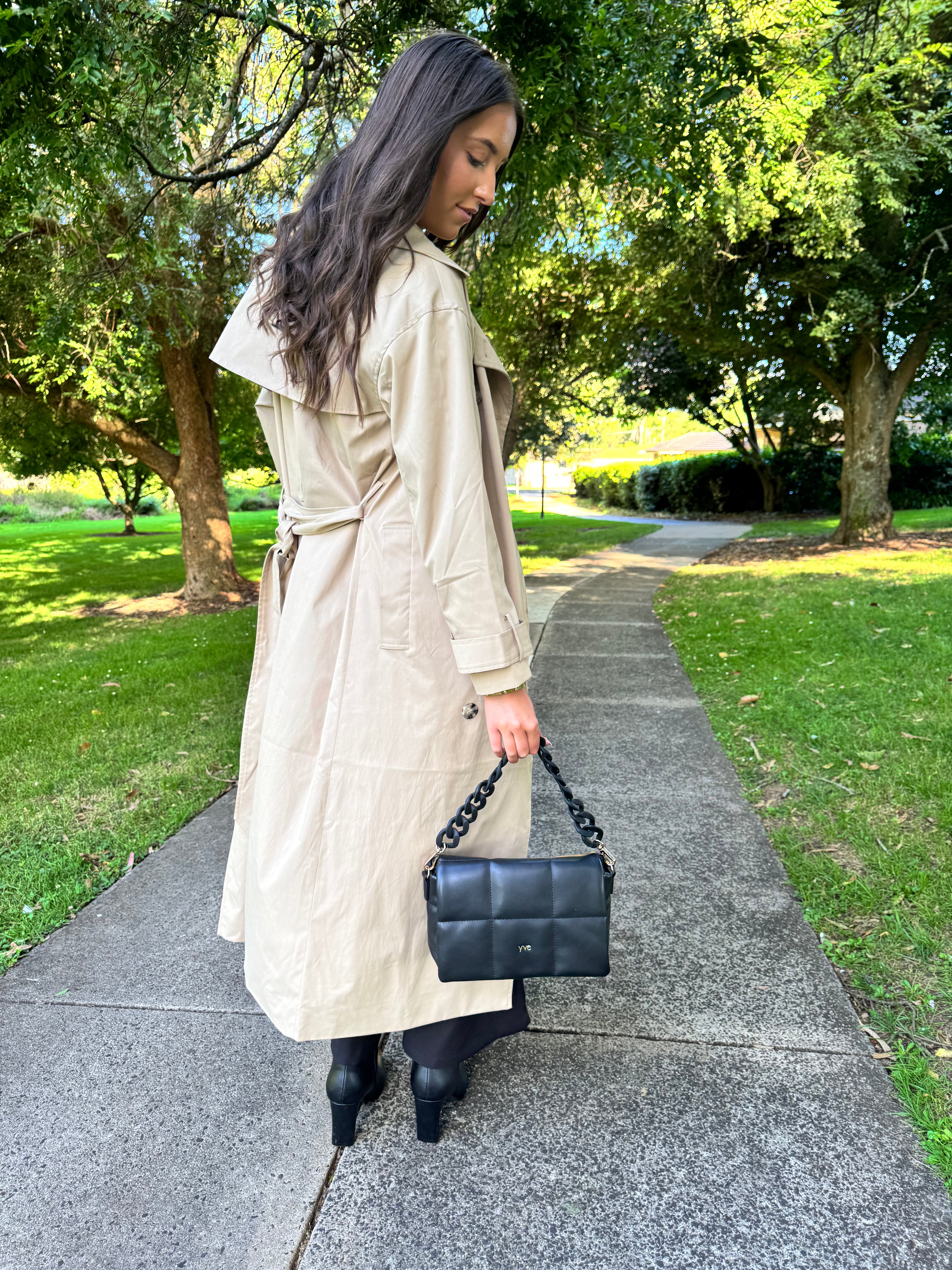 Introducing the Yve Black Wave Bag - the perfect combination of elegance and style for any occasion. Its unique wave design adds a modern touch to your look. With 2 compartments and the option to wear it cross body or over the shoulder, it provides both functionality and fashion. Upgrade your accessory game with this essential piece.