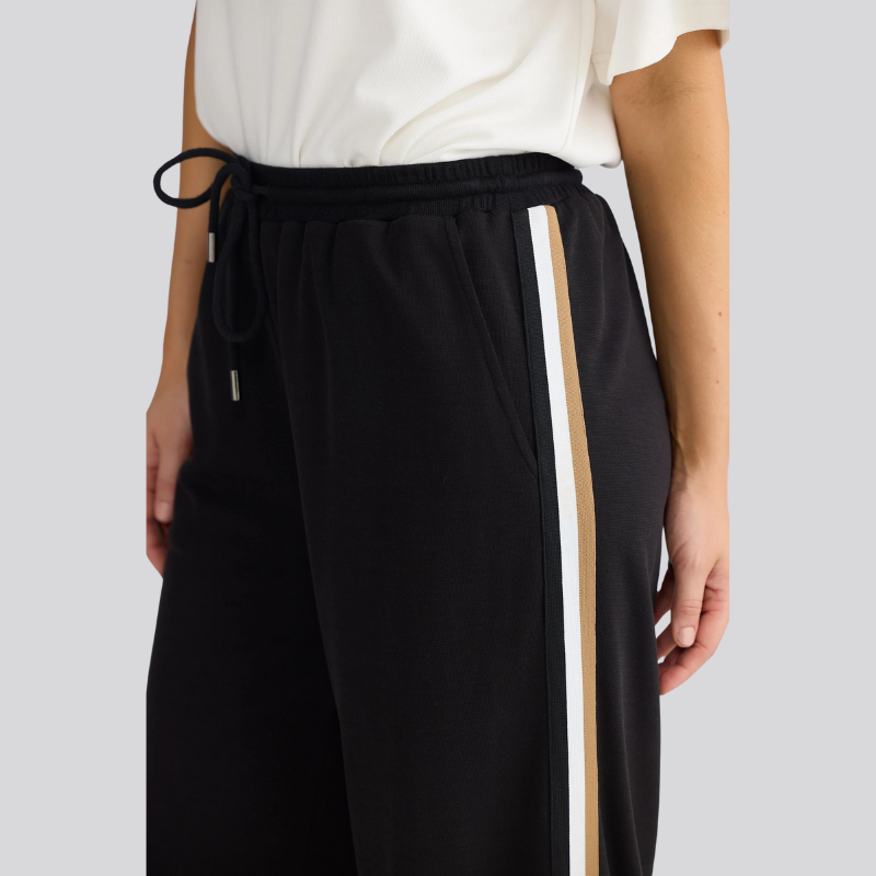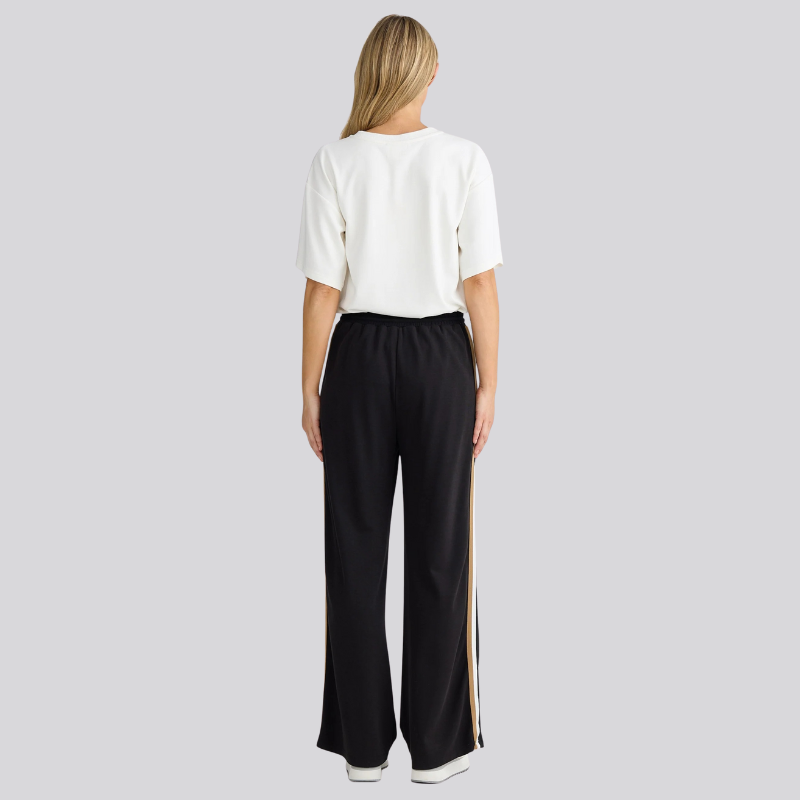 The Hometime Pants combine classic comfort with refined style, featuring a straight leg and standard fit for a flattering silhouette. Crafted from soft double knit jersey, these full-length pants offer gentle stretch and a smooth feel. The elasticated waistband ensures an effortless fit, while the subtle stripe trim along the sides adds a touch of understated sophistication. Perfect for both relaxing at home and casual outings, these pants elevate everyday wear with exquisite detailing.