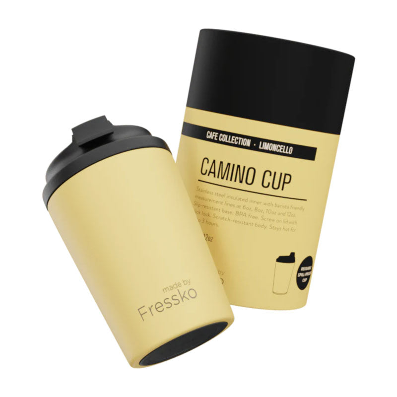 This Camino Cup is a gorgeous limoncello yellow colour. The stylish reusable cup is made from stainless steel to keep your coffee hot for up to 3 hours and insulated for cold drinks. The perfect on the go reusable cup, it fits under standard coffee machines, fits in a standard car cup holder and the outer stays cool to the touch. A world barista approved cup, it has internal size lines and an easy to use click back screw on lid. It is leak proof and scratch resistant, making it the perfect travel cup.