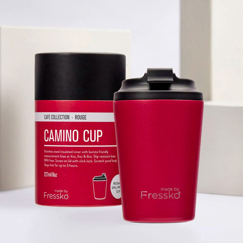 This Camino Cup is a gorgeous rouge red colour. The stylish reusable cup is made from stainless steel to keep your coffee hot for up to 3 hours and insulated for cold drinks. The perfect on the go reusable cup, it fits under standard coffee machines, fits in a standard car cup holder and the outer stays cool to the touch. A world barista approved cup, it has internal size lines and an easy to use click back screw on lid. It is leak proof and scratch resistant, making it the perfect travel cup.