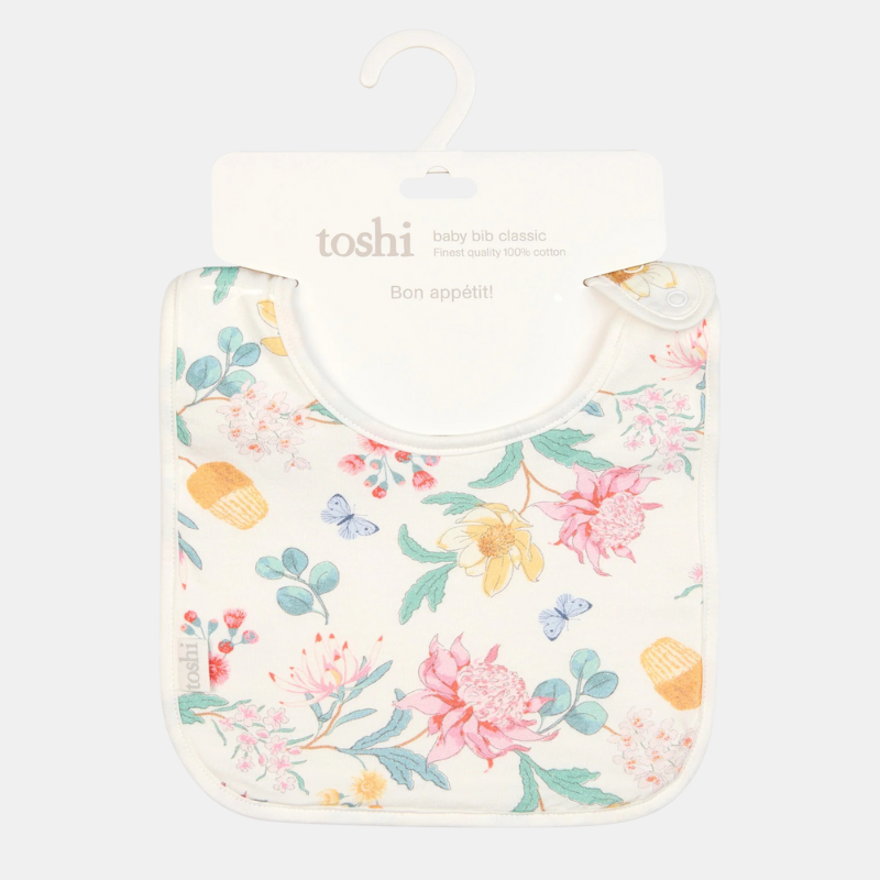 The Bib Down Under - Waratah Dawn combines playful charm with premium comfort. Made from soft 100% cotton and featuring a vibrant, exclusive Toshi print, it keeps your little one’s skin cozy and dry with absorbent cotton towelling at the back. Adjustable press studs ensure a perfect fit for every mealtime adventure. Stylish, gentle, and oh-so-useful—let your baby explore tasty treats in comfort and fun!
